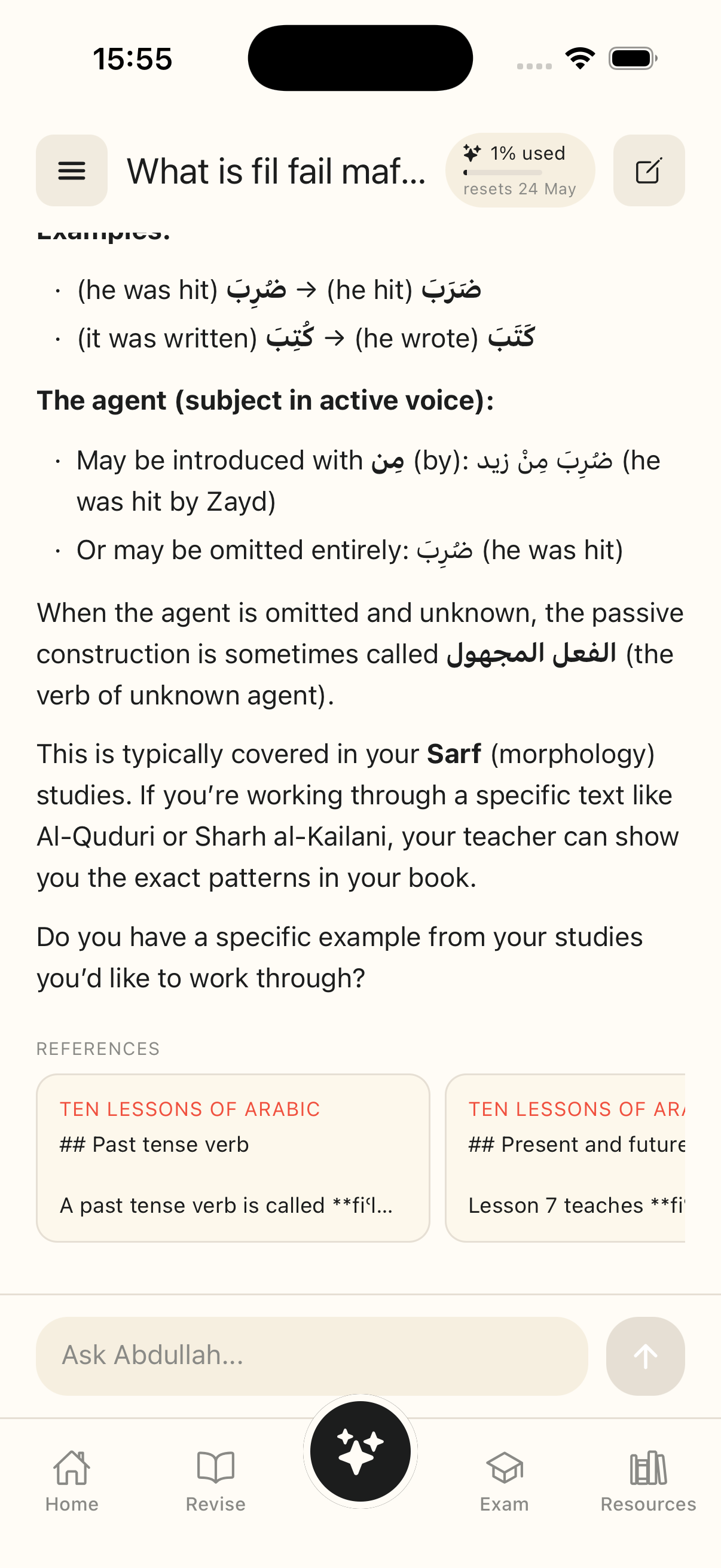 Stuck on a masʾalah? Abdullah answers your fiqh and usul questions, quotes the daleel, and drops you straight to the exact chapter to revise.
