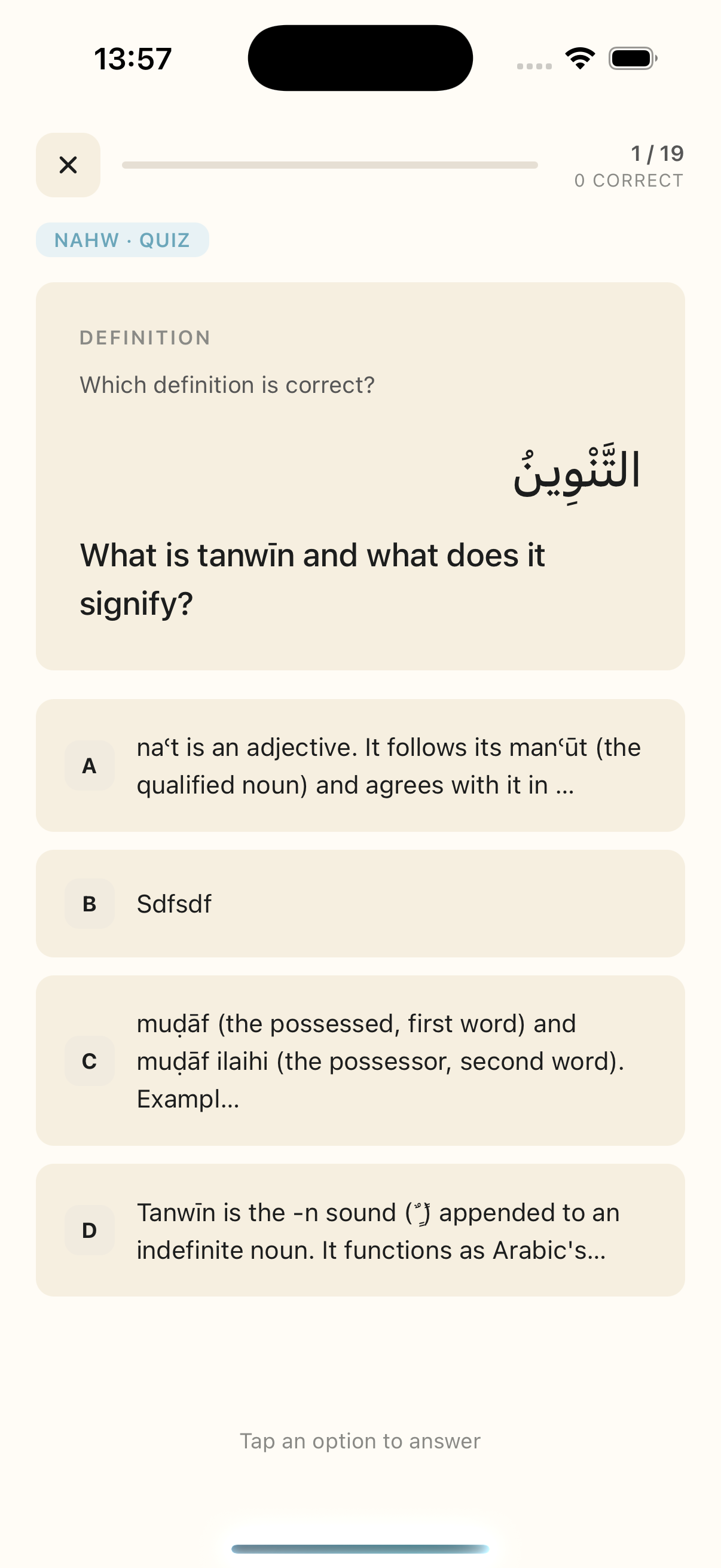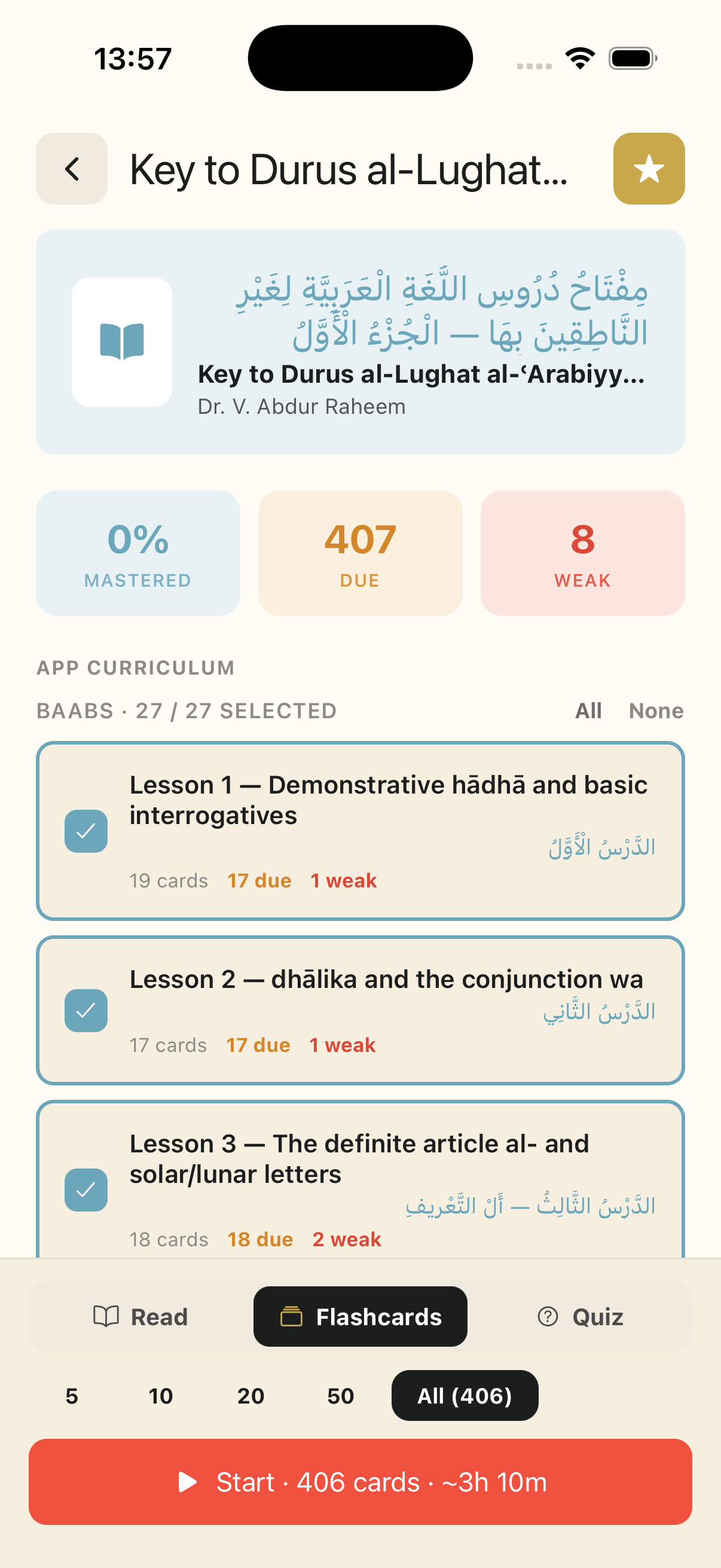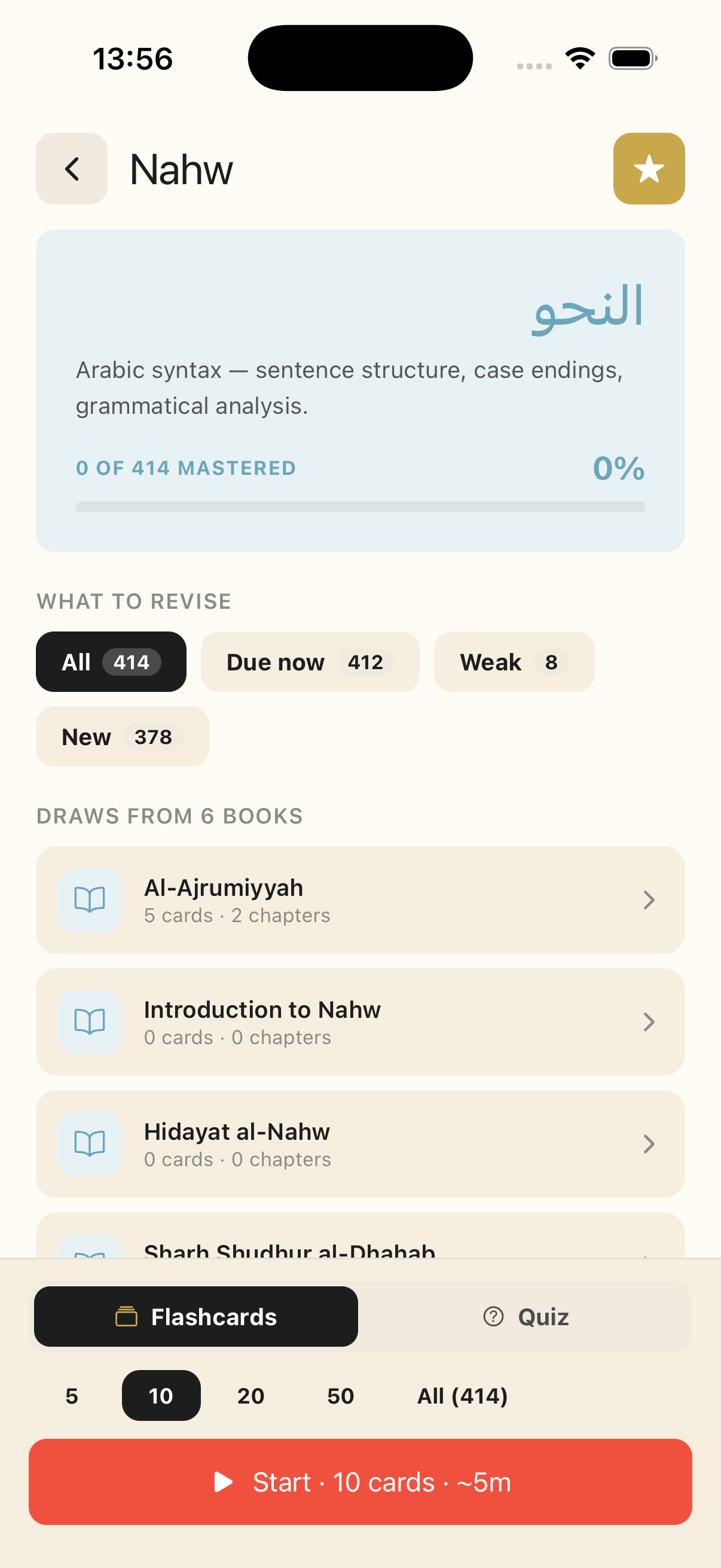 Re-read your books. Drill flashcards. Compete with your halaqah. Sit mock exams. One app, mapped to your exact syllabus, from Nahw to Bukhari.
