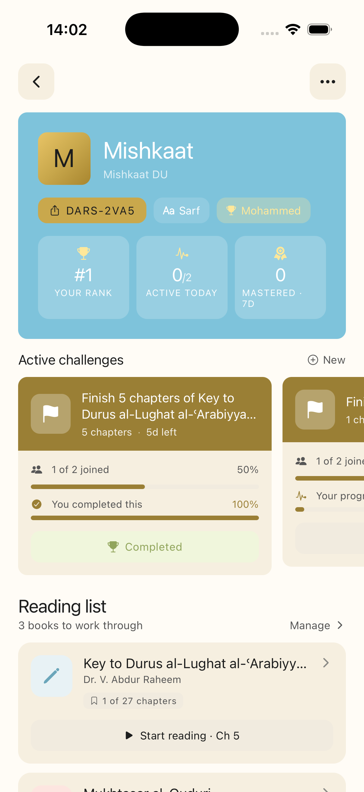 Join your class inside the app. Quiz each other, revise together, and keep track of who's ahead, the whole halaqah pulling each other through the syllabus.