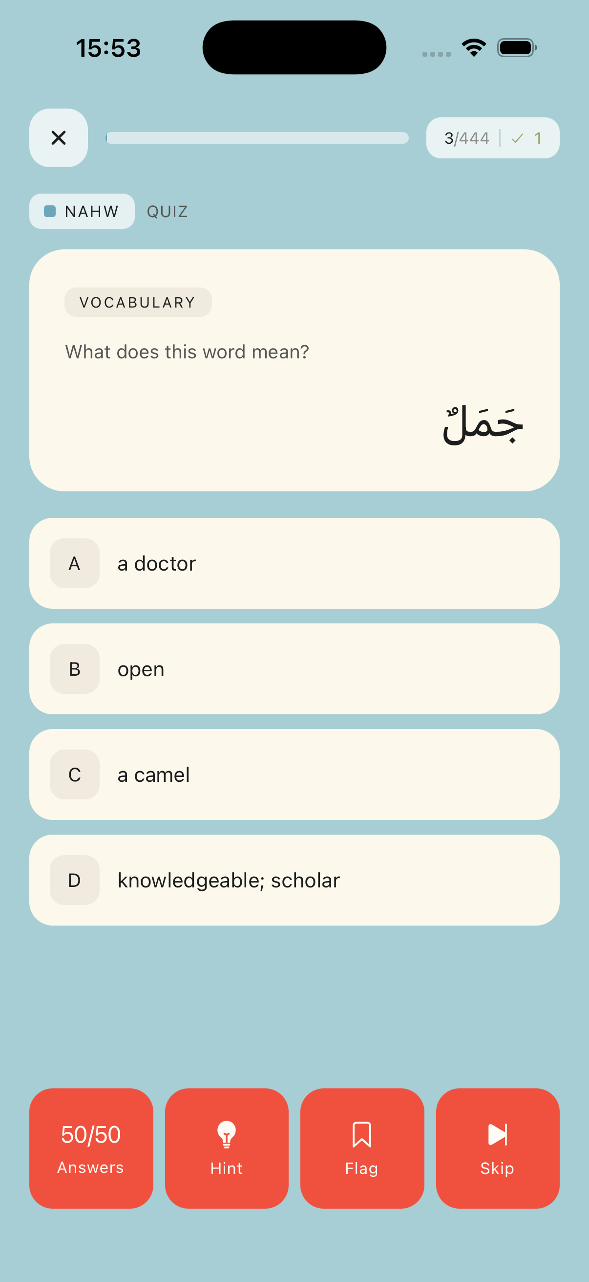 Re-read your books. Drill flashcards. Compete with your halaqah. Sit mock exams. One app, mapped to your exact syllabus, from Nahw to Bukhari.